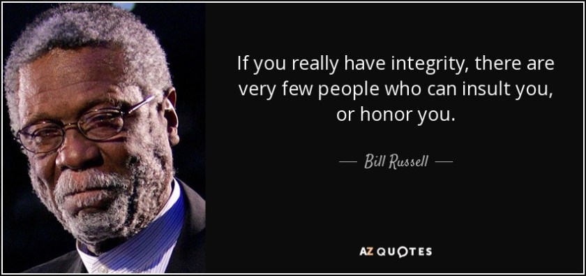 An insightful observation from the great Bill Russell about Integrity In order to have it, you need to define the principles by which you choose to live and lead. And by following those principles, you can expect that you will gain the respect of some and the disdain of others.